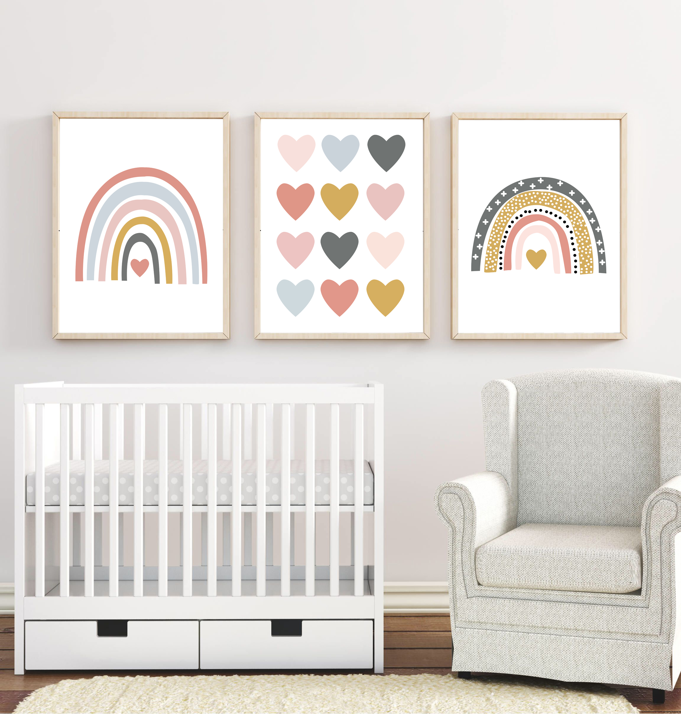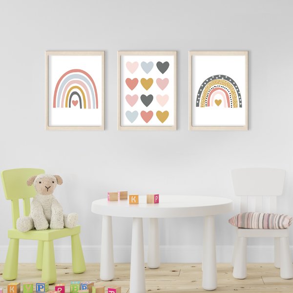 Dos arcoíris de amor y pequeños corazones llenan el cuarto de calidez, color y dulzura. Este set celebra la llegada de tu bebé como un milagro único, y transforma su espacio en un rincón lleno de ternura y alegría.