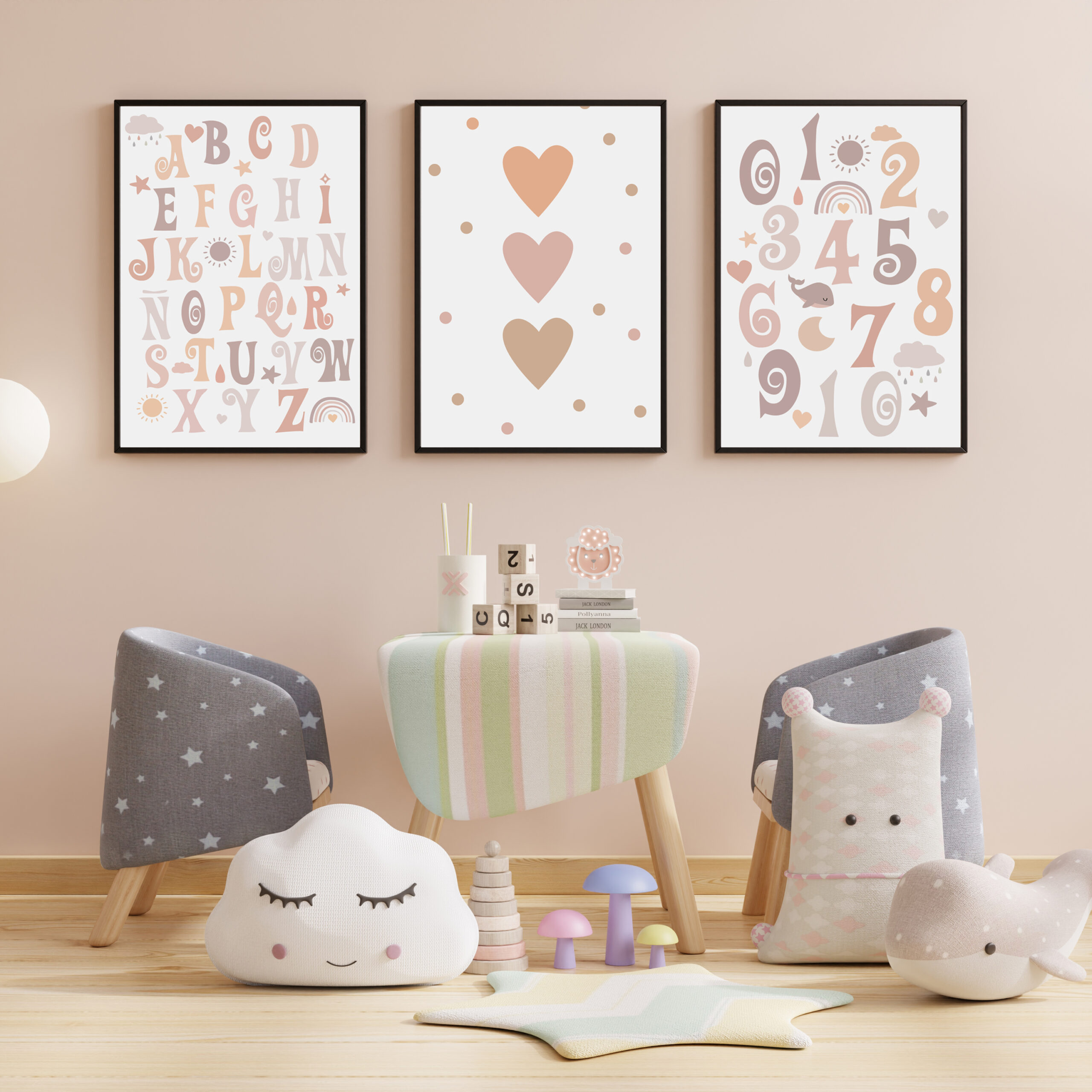 Con tonos cálidos y estilo boho, este set combina letras, números y corazones para acompañar con amor, suavidad y aprendizaje los primeros descubrimientos de su bebé.