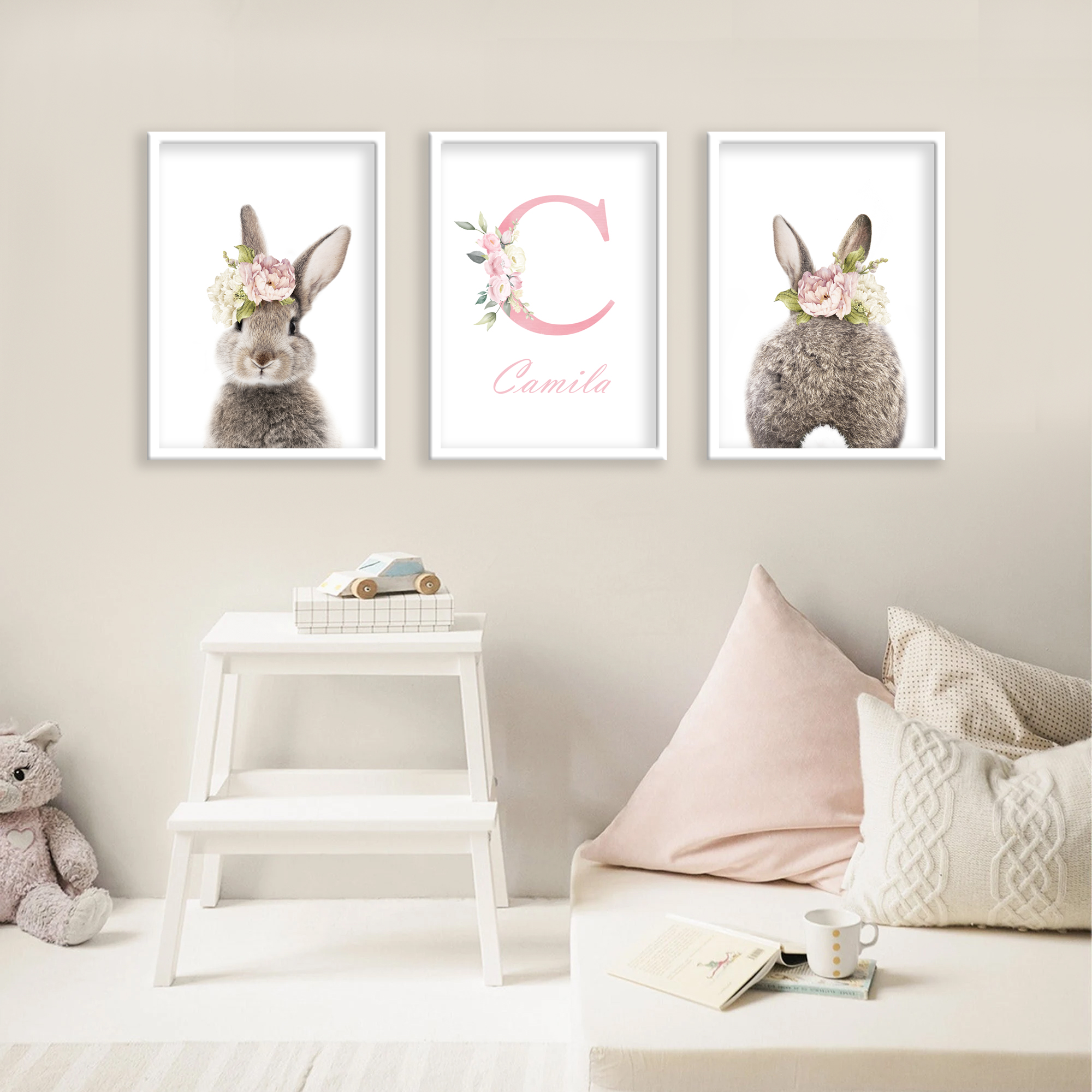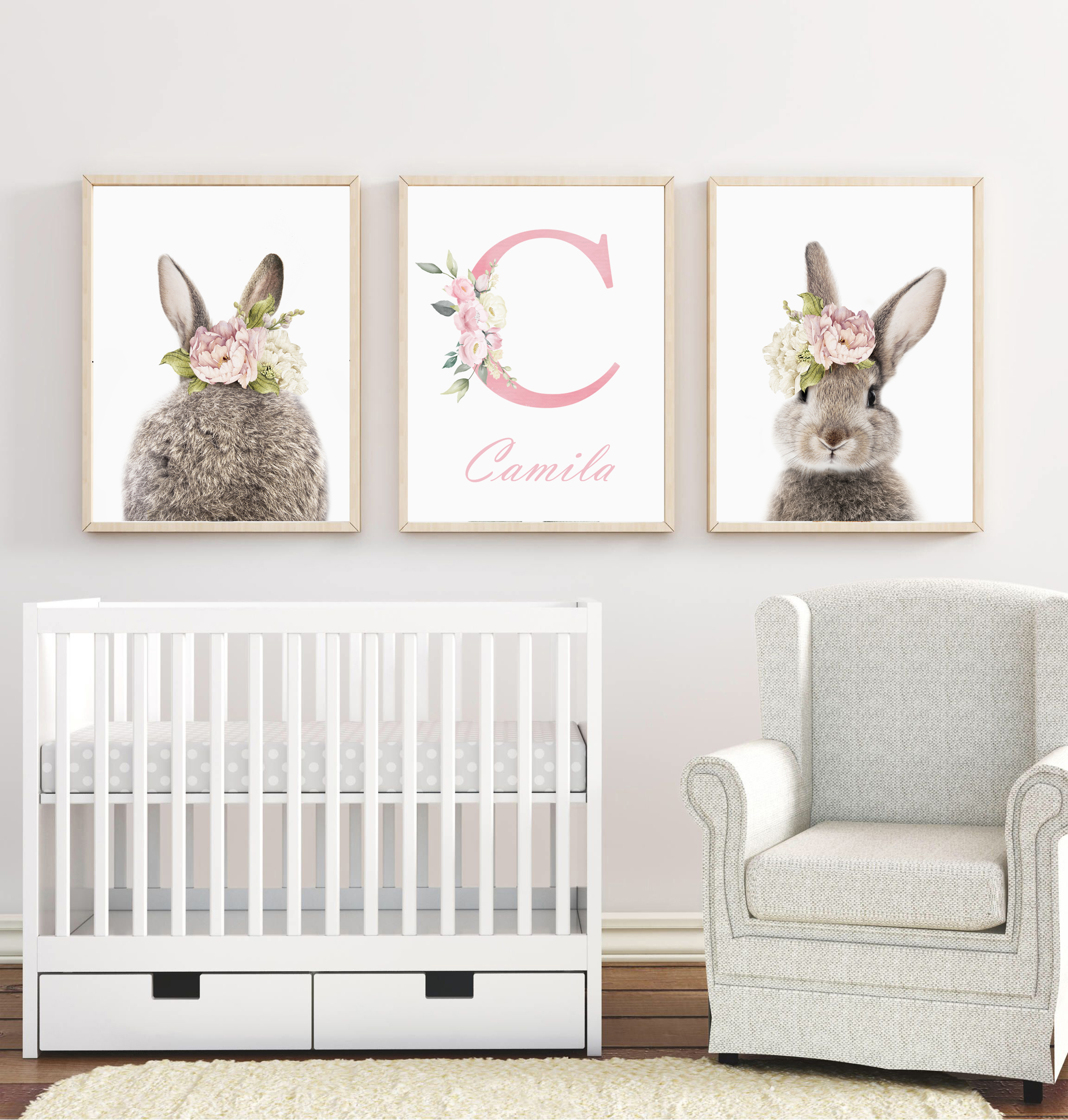 Conejos Floreados: una propuesta encantadora y delicada, ideal para personalizar el espacio de tu bebé con ternura. Los conejitos realistas con coronas florales y la opción de nombre personalizado aportan calidez, estilo y un toque único al cuarto infantil.