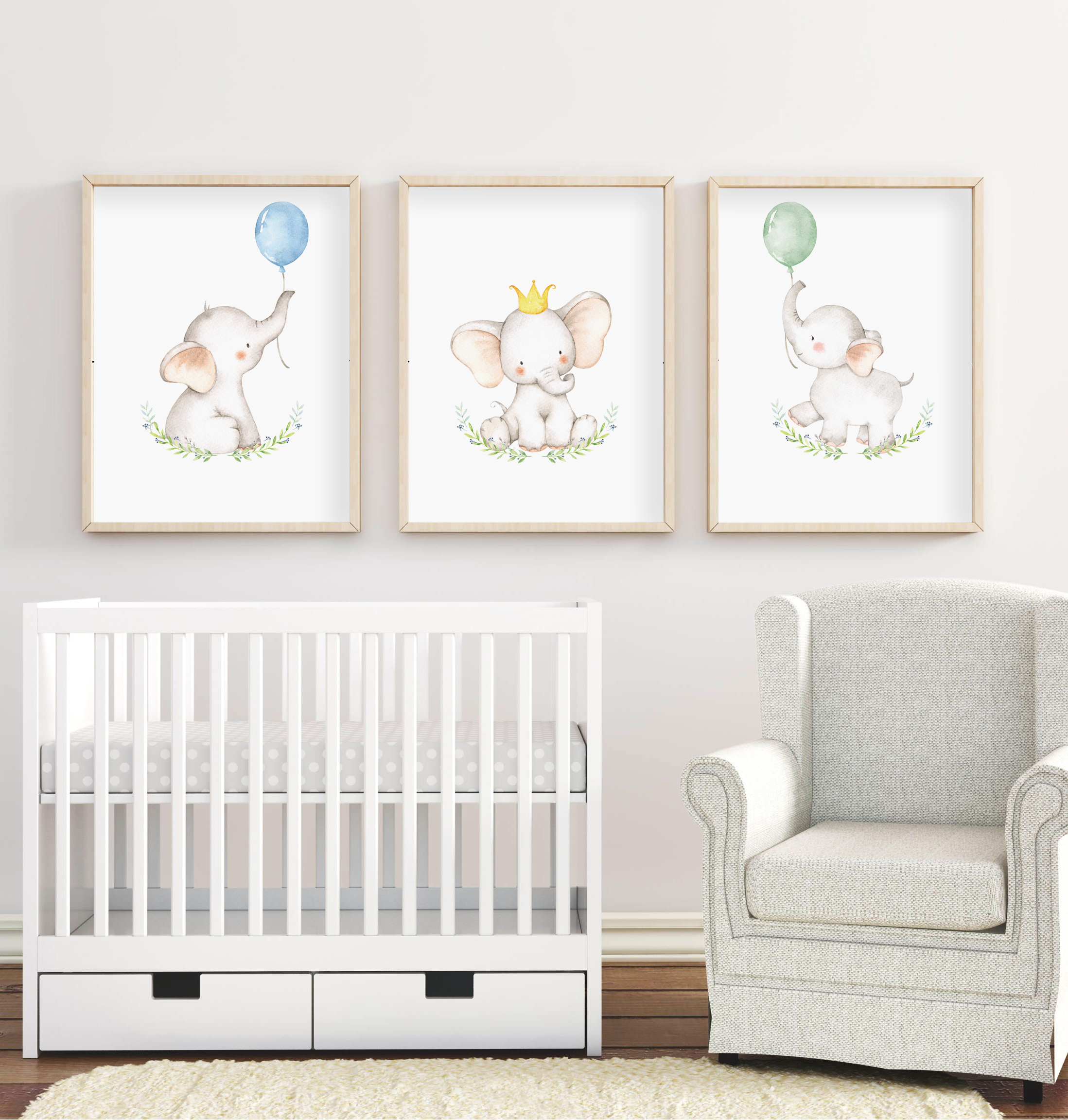 Tres elefantitos encantadores juegan con globos y coronas en una escena dulce y delicada que transmite ternura, inocencia y elegancia para su pequeño tesoro.
