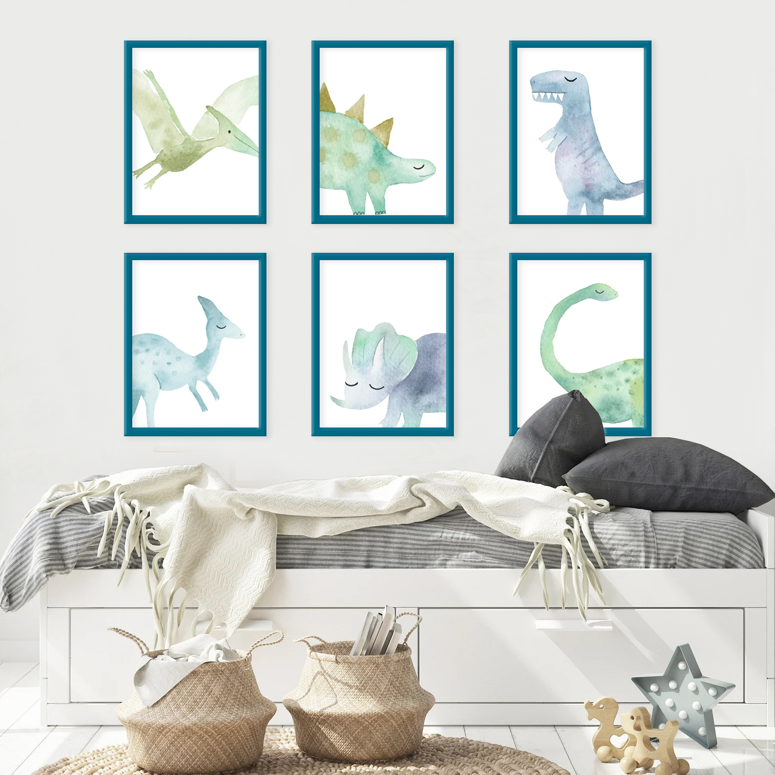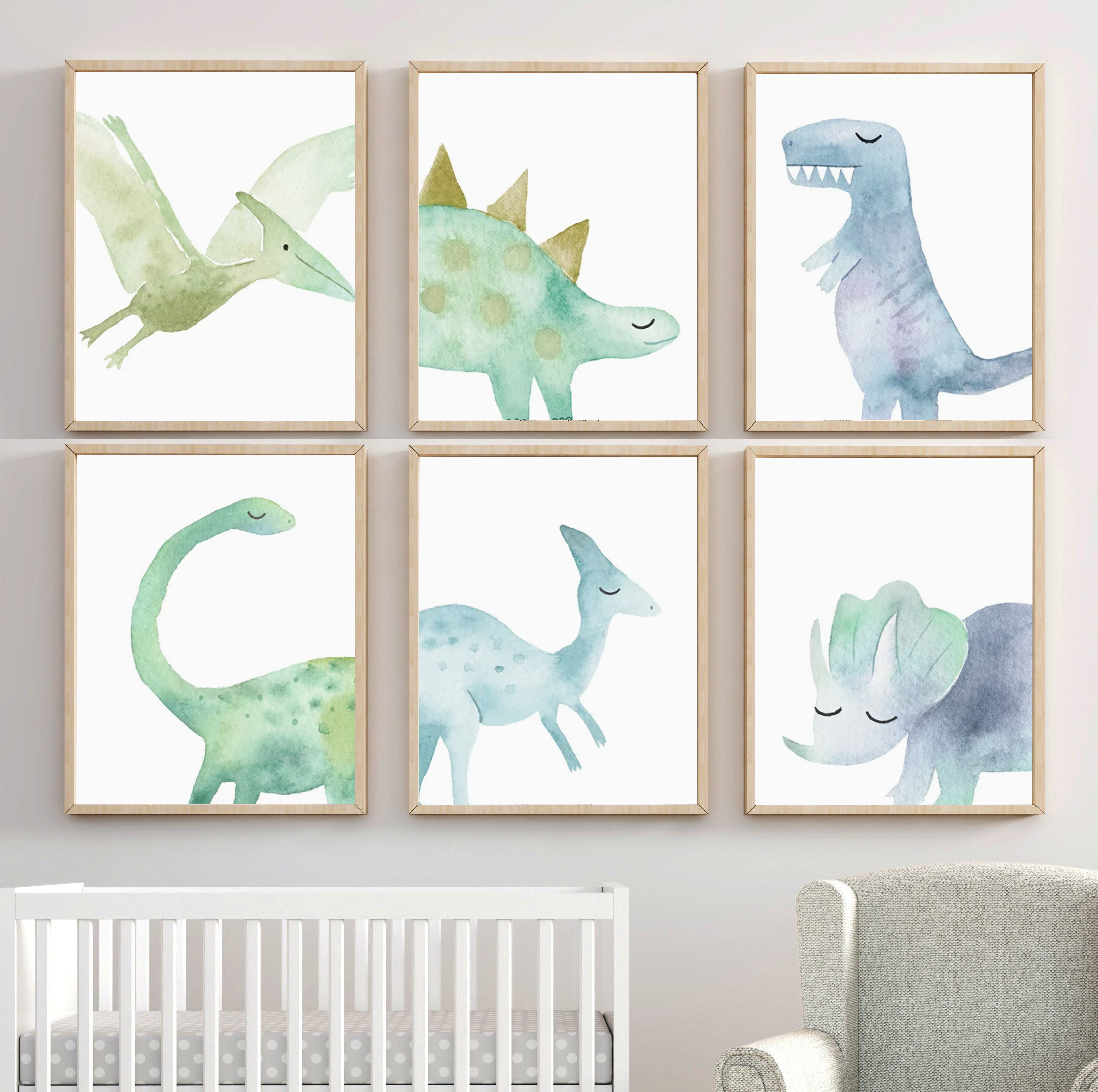 La siesta de los dinos: una serie de seis ilustraciones en acuarela que muestran tiernos dinosaurios con los ojos cerrados, transmitiendo calma, dulzura y serenidad. Perfectos para crear un ambiente tranquilo y acogedor en el dormitorio infantil, ideal para acompañar el momento del descanso.