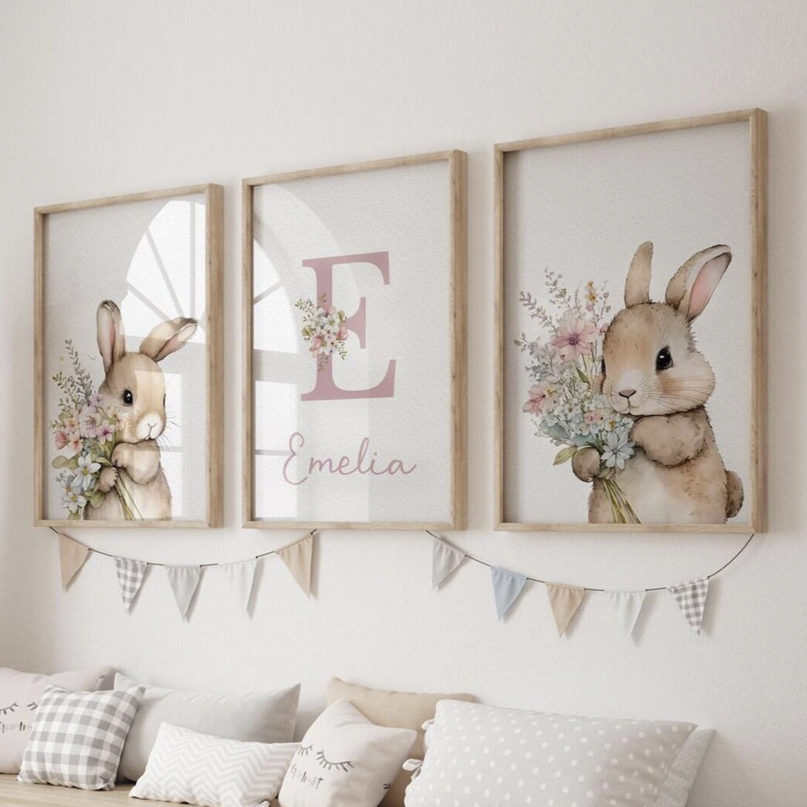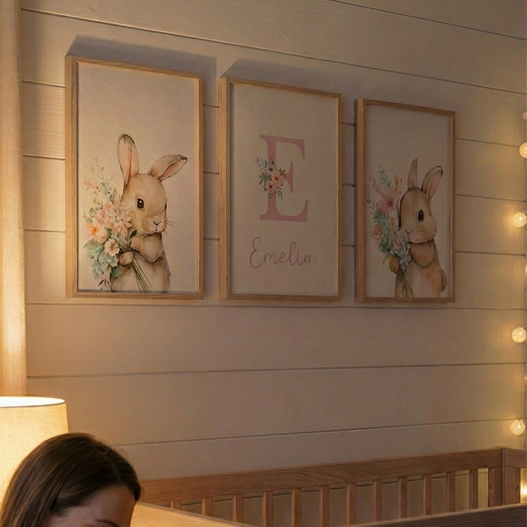 Un set que ilumina las noches con ternura: conejitos suaves, flores delicadas y la inicial de tu bebé creando un rincón lleno de amor, calma y magia antes de dormir.