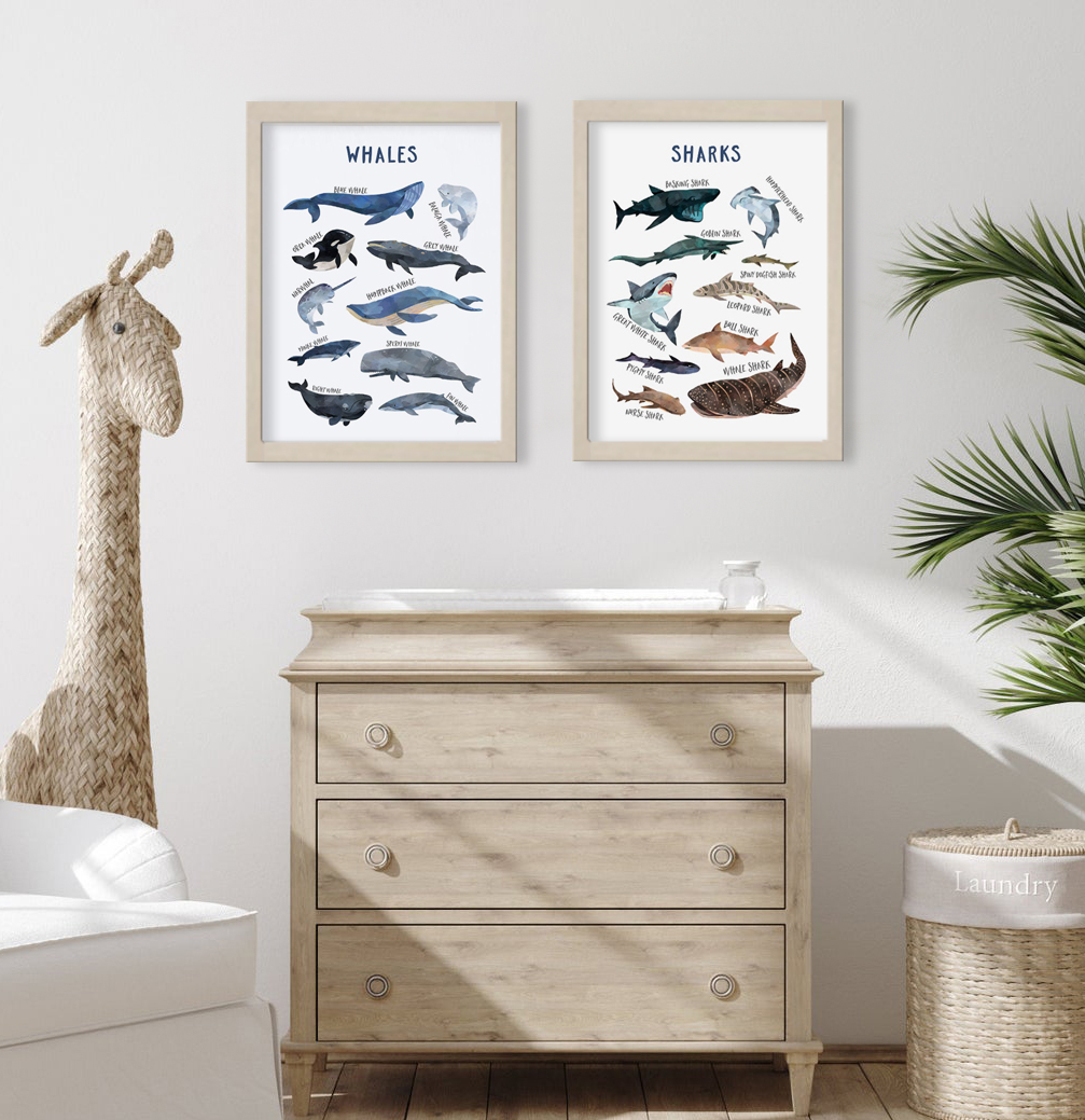 Ilustraciones educativas y realistas de tiburones y ballenas. Ideal para niños curiosos y amantes del océano. Diseñado con estilo acuarela en tonos marinos, este dúo combina belleza y aprendizaje para decorar el cuarto con un toque oceánico y aventurero.