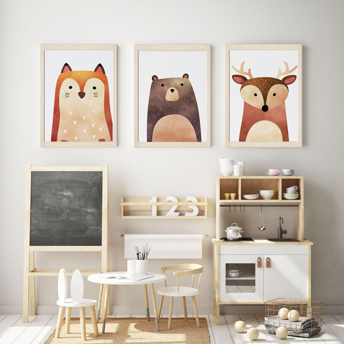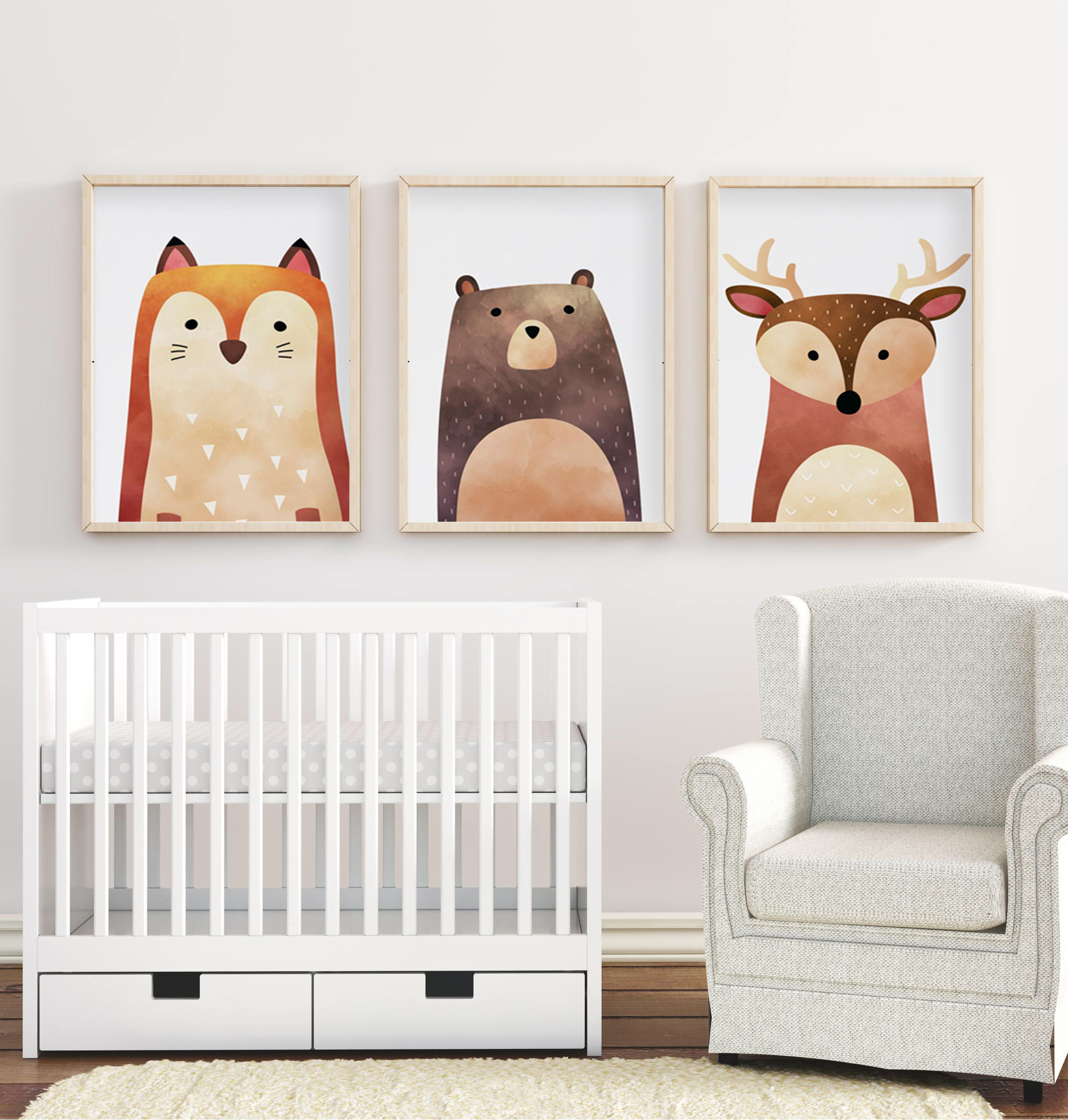 Tres adorables animales del bosque en estilo nórdico minimalista: oso, ciervo y zorrito. Tonos cálidos, suaves y terrosos, perfectos para crear un ambiente acogedor y natural en el cuarto del bebé. Ideal para una decoración simple, moderna y con un toque silvestre.